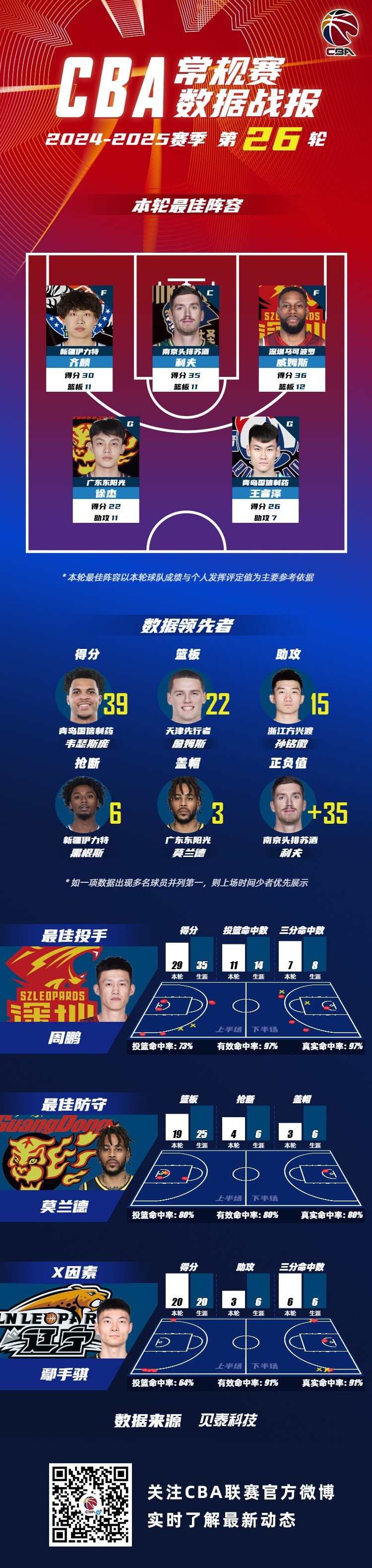 2024-2025賽季CBA聯(lián)賽常規(guī)賽第26輪結(jié)束較量,來自新疆廣匯籃球俱樂部的齊麟 、南京同曦籃球俱樂部的利夫、深圳新世紀(jì)烈豹籃球俱樂部的威姆斯、廣東宏遠(yuǎn)籃球俱樂部的徐杰和青島國信海天籃球俱樂部的王睿澤入選CBA聯(lián)賽常規(guī)賽第26輪最佳陣容!