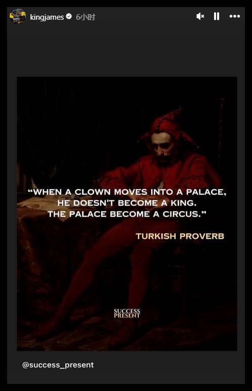 發(fā)布時間:2025年02月10日 08:52點擊:欄目:籃球新聞 02月10日訊 詹姆斯更新社交媒體,轉發(fā)了一段雞湯。“小丑進皇宮不會變國王,皇宮反而會變馬戲團——土耳其諺語”貼文寫道。 除特別注明外,本站所有內容均為九球直播整理排版,轉載請注明出處:詹姆斯轉發(fā)雞湯:小丑進皇宮不會變國王 皇宮反而會變馬戲團 本文標簽: 籃球 nba 湖人 詹姆斯