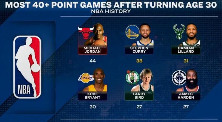 發(fā)布時間:2025年02月11日 09:53點(diǎn)擊:欄目:籃球新聞 2月11日訊 今天NBA多場比賽進(jìn)行,轉(zhuǎn)播方曬出一組數(shù)據(jù),30歲以上球員砍下40+場次數(shù)的排行榜如下:1、喬丹,44次2、庫里,38次3、利拉德,31次4、科比,30次5、伯德,27次5、哈登,27次 除特別注明外,本站所有內(nèi)容均為九球直播整理排版,轉(zhuǎn)載請注明出處:30歲以上球員40+場數(shù)排行榜:喬丹44場第一 庫里利拉德科比居其次 本文標(biāo)簽: nba 籃球 公牛 勇士 庫里 雄鹿 利拉德 湖人 科比 凱爾特人 快船 哈登 喬丹