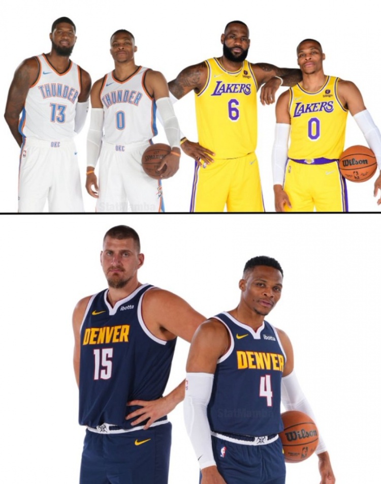 威少和三位不同的隊友分別拿到過三雙,歷史首人,其余兩位隊友是詹姆斯和喬治。