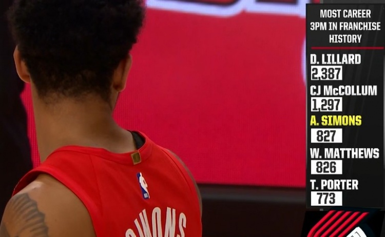目前,安芬尼-西蒙斯三分8中4,他在開(kāi)拓者已經(jīng)投進(jìn)了827記三分球,超越馬修斯,上升至開(kāi)拓者隊(duì)史第三,僅次于利拉德和CJ-麥科勒姆。
