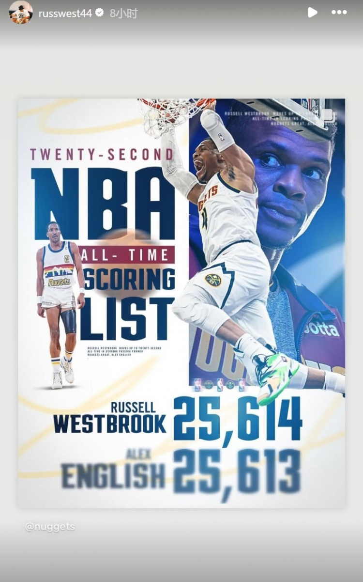 發(fā)布時(shí)間:2025年01月05日 20:50點(diǎn)擊:欄目:籃球新聞 1月5日訊 掘金客場122-111加時(shí)復(fù)仇馬刺。威少首發(fā)出戰(zhàn)36分16秒,11中4,三分4中1砍下9分10籃板6助攻3搶斷1蓋帽,其中4個(gè)前場籃板。在本場比賽中,威少的常規(guī)賽生涯總得分超越名宿阿歷克斯-英格利什,升至NBA歷史第22位。 除特別注明外,本站所有內(nèi)容均為九球直播整理排版,轉(zhuǎn)載請注明出處:威少生涯總得分超英格利什&上升至NBA歷史第22位 本人轉(zhuǎn)發(fā) 本文標(biāo)簽: nba 籃球 掘金 威少