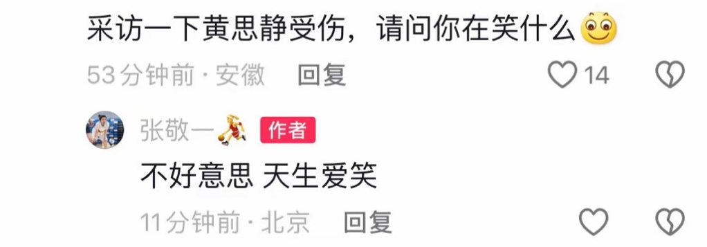 有網(wǎng)友在社媒“聲討”北京女籃隊(duì)員張敬一:“采訪一下黃思靜受傷,請問你在笑什么。”。張敬一則回應(yīng):“不好意思,天生愛笑。”