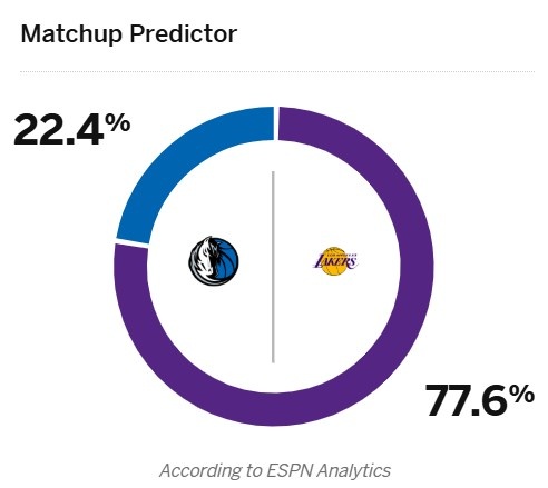 ESPN預(yù)測(cè)了本場(chǎng)比賽勝率,其中主場(chǎng)作戰(zhàn)的湖人勝率高達(dá)77.6%,獨(dú)行俠為22.4%。