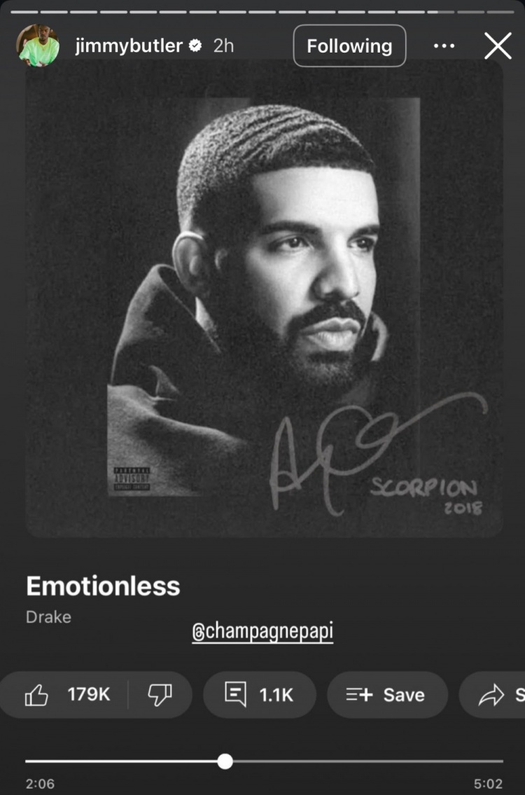 1月6日訊 今天,熱火球員巴特勒更新了Instagram story,曬出Drake的一首歌《Emotionless》(無動于衷)。