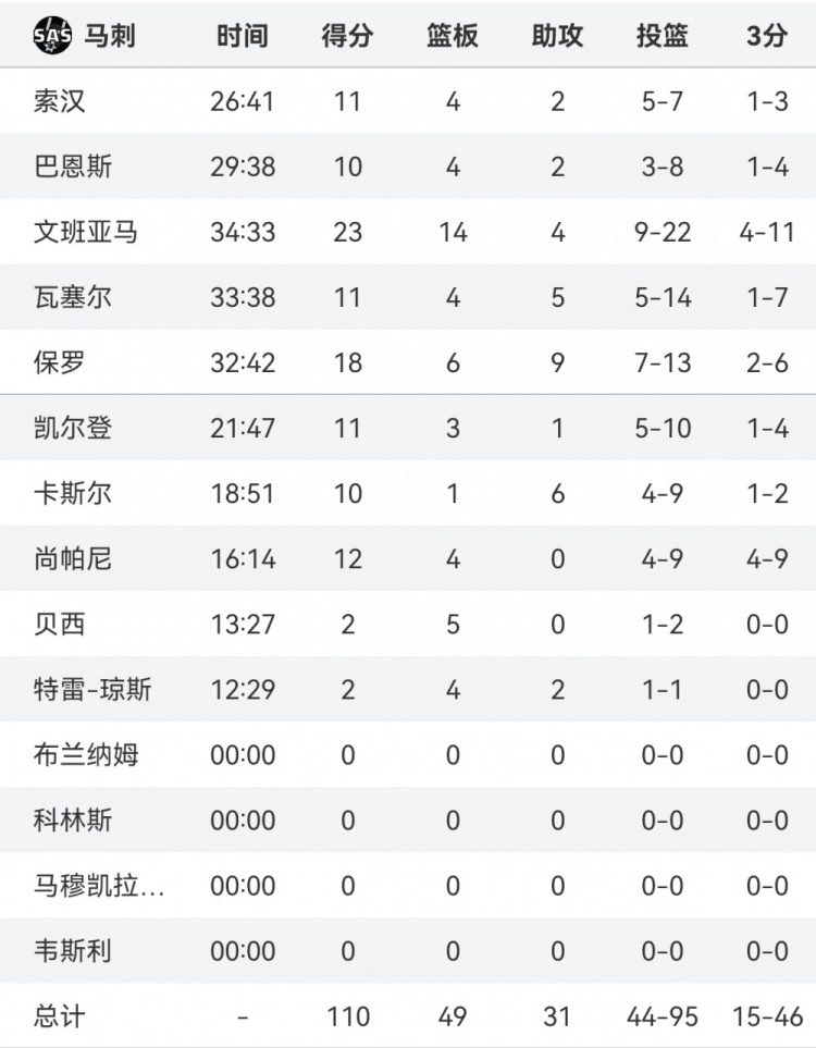 本場比賽,馬刺全隊多點開花、共8人得分上雙,且最多時曾領先19分,但無奈遭到逆轉。