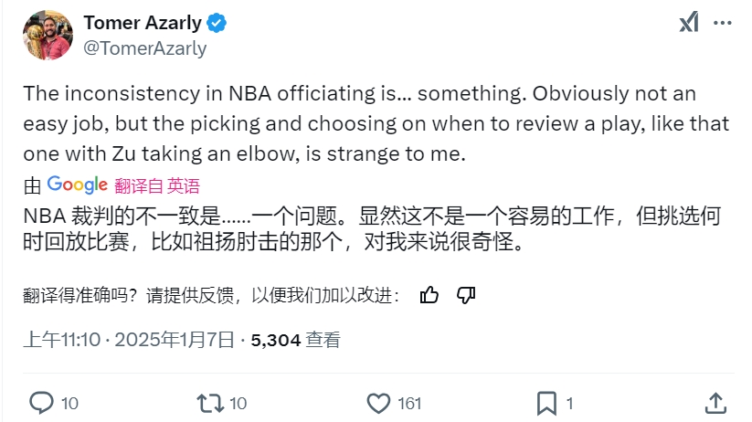 船記Azarly發(fā)推吐槽裁判判罰尺度一直在變