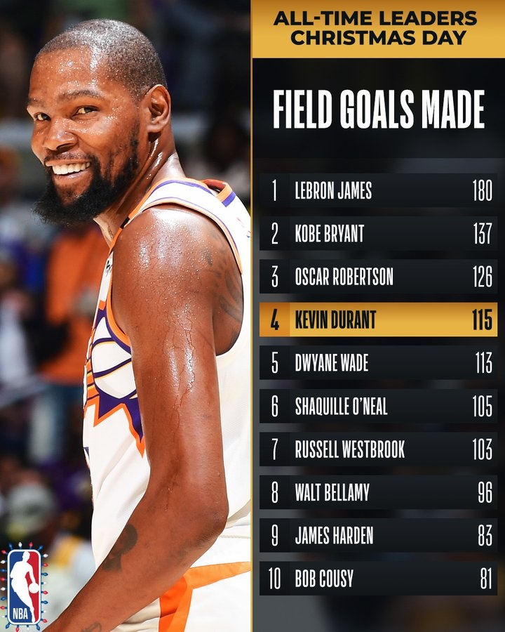 至此,杜蘭特的圣誕大戰(zhàn)運(yùn)動(dòng)戰(zhàn)進(jìn)球數(shù)來(lái)到了115個(gè),超越韋德(113)升至NBA歷史第四位。
