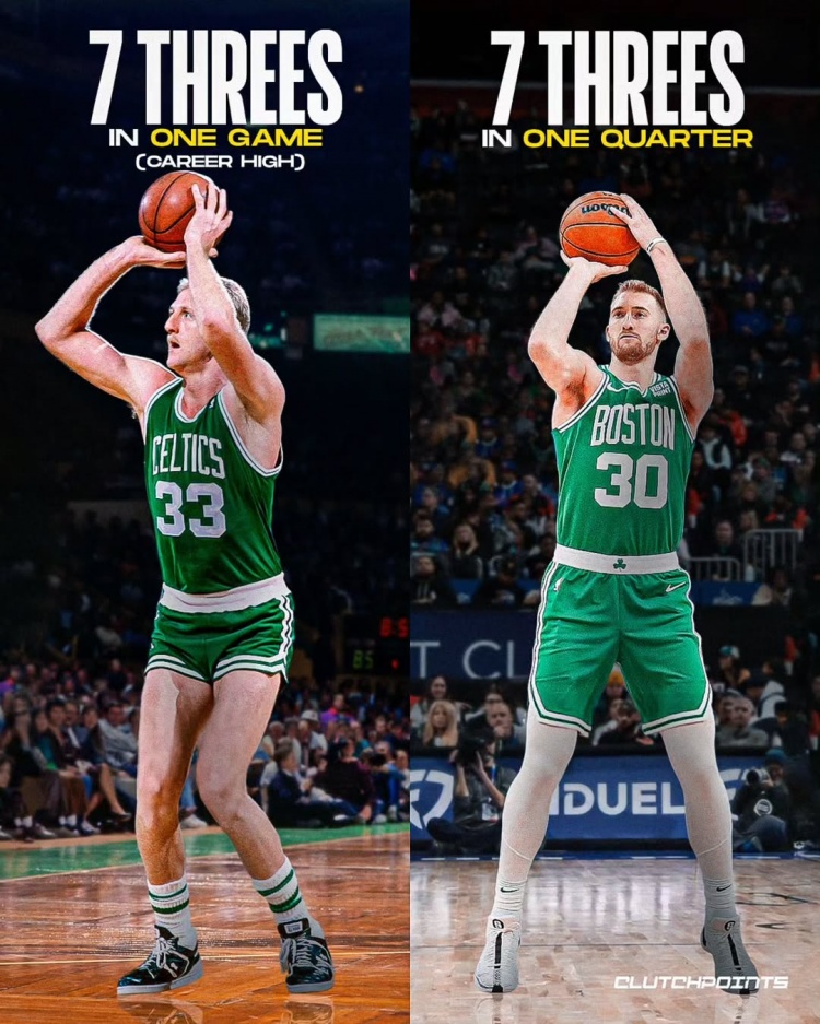 在今天凱爾特人114-108戰(zhàn)勝爵士的比賽中,豪澤全場(chǎng)命中9記三分,其中第三節(jié)便命中7記三分,只用一節(jié)就追平了綠軍名宿伯德的生涯單場(chǎng)三分命中紀(jì)錄。