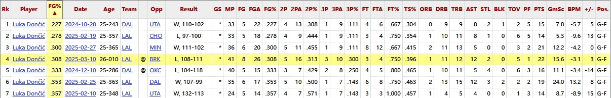 此役,東契奇30.8%的命中率創(chuàng)下了本賽季他個(gè)人的第四低。值得一提的是,在他本賽季命中率最低的7場(chǎng)比賽中有5場(chǎng)是在轉(zhuǎn)會(huì)至湖人后打出的。