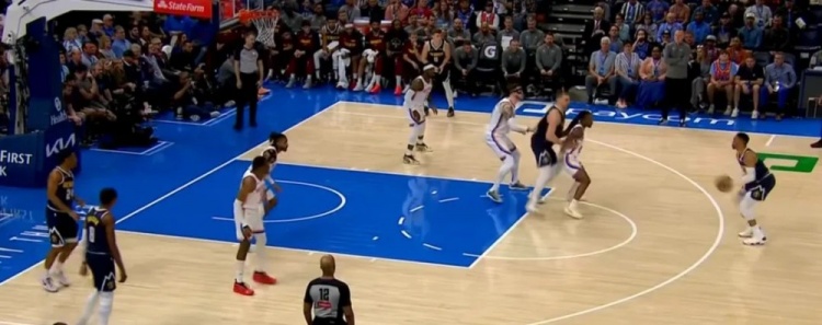 但是,由于威少(也可以是布勞恩)強(qiáng)勢(shì)的身體和出球能力,會(huì)讓他在類似的回合里,給對(duì)位的防守人不小的壓力。而對(duì)手想在約基奇、波特、穆雷都在三分線上的時(shí)候支援中路,恐怕也不那么容易。如果你有單防弱點(diǎn)要藏,掘金可以用這種方式去無(wú)球針對(duì)。