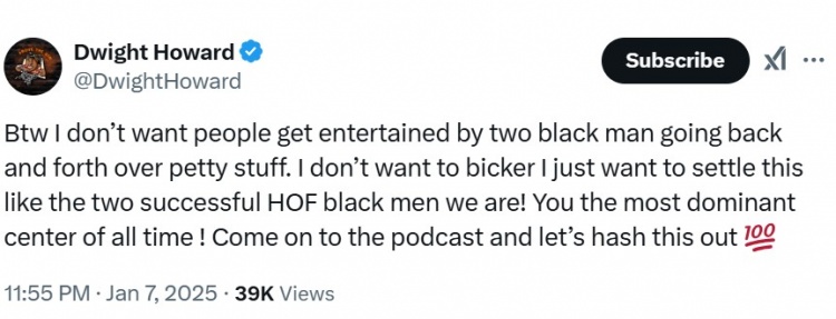 今天,霍華德再次回應(yīng)道:“順便說一句,我不想人們因?yàn)槲覀儍蓚€(gè)黑子之間雞毛蒜皮的小事而爭吵。我不想斗嘴,我只想我們能夠像兩個(gè)成功的名人堂成員那樣解決問題。你是有史以來最具統(tǒng)治力的中鋒。歡迎來播客,我們一起來解決這個(gè)問題?!?/p>