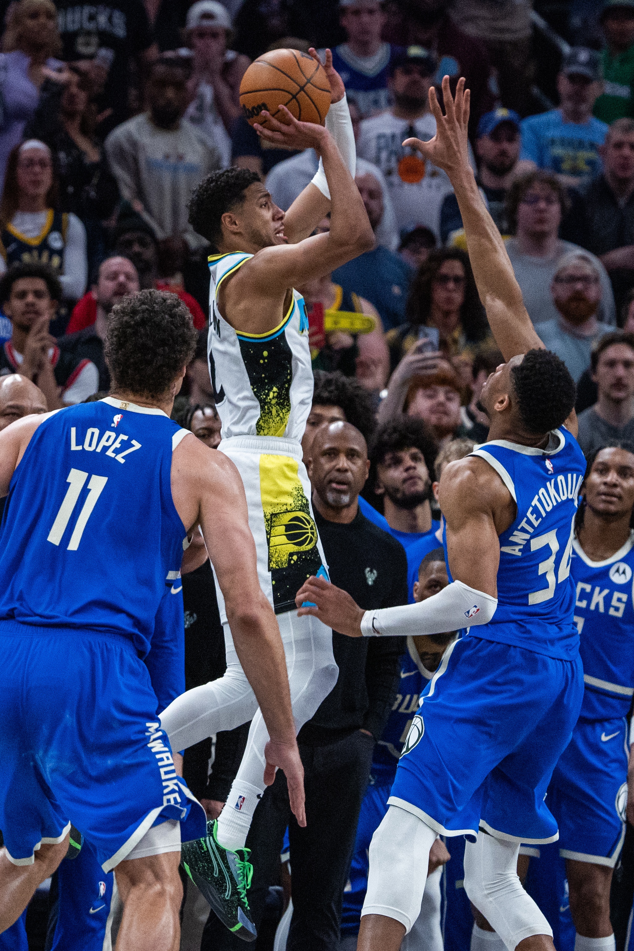 哈利伯頓在比賽最后時刻沿左側邊線切入,接手遞手邊線發(fā)球,面對字母哥的防守,在空中失衡的情況下命中后仰漂移三分,并且獲得了加罰。哈利伯頓罰球命中取得1分領先優(yōu)勢后,只留下3.4秒,字母哥接球沖到前場三分不中,步行者取得比賽勝利。