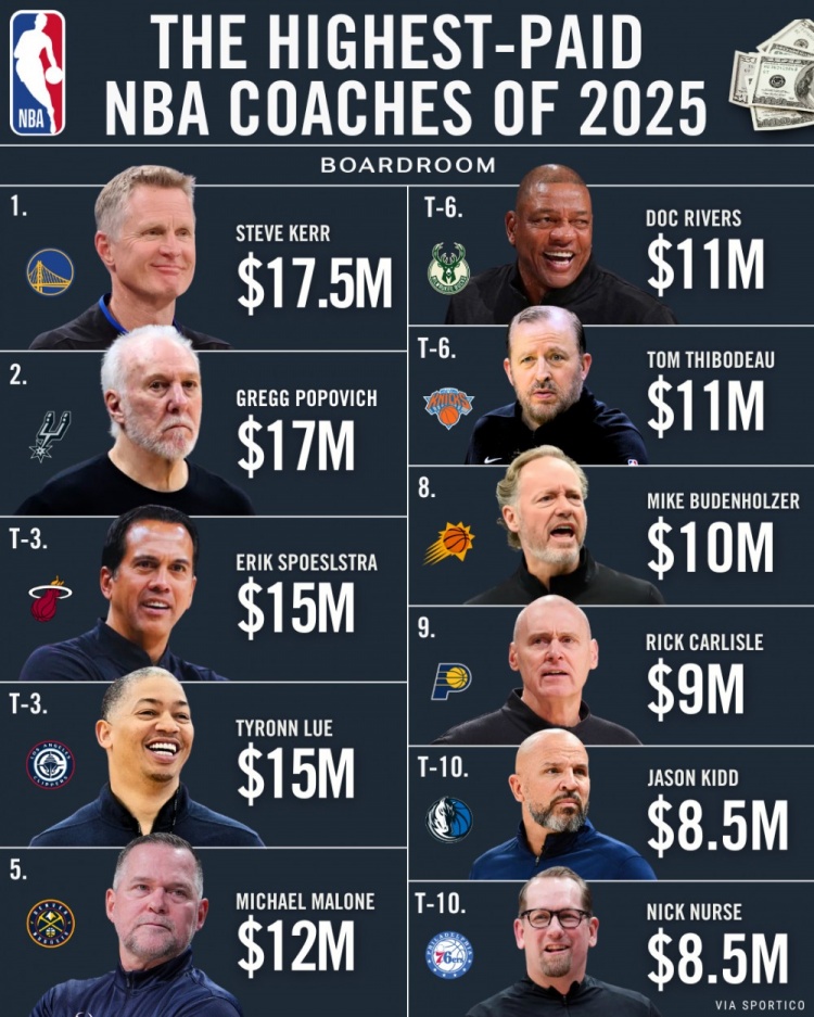 發(fā)布時(shí)間:2025年01月08日 05:50點(diǎn)擊:欄目:籃球新聞 除特別注明外,本站所有內(nèi)容均為九球直播整理排版,轉(zhuǎn)載請(qǐng)注明出處:本賽季主教練收入:科爾1750萬居首 雷霆與騎士主帥未進(jìn)前十 本文標(biāo)簽: nba 籃球 西部 東部 勇士 馬刺 快船 雷霆 騎士 76人 掘金 熱火 步行者 獨(dú)行俠 雄鹿 尼克斯 太陽