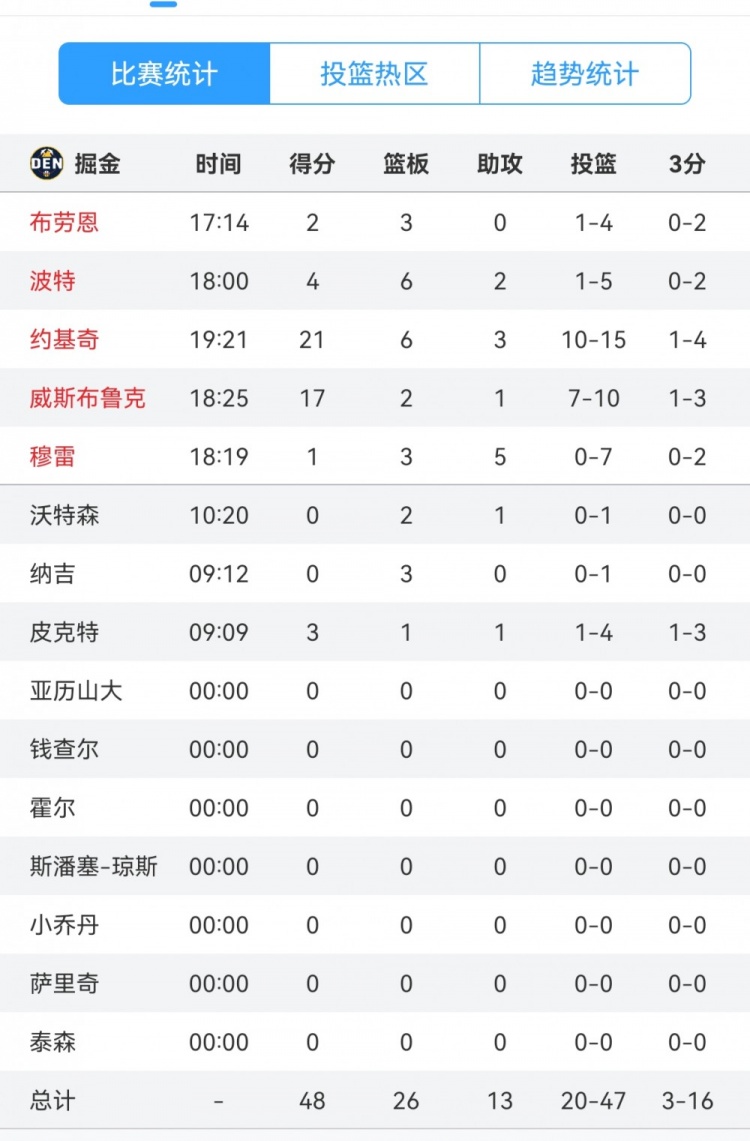 發(fā)布時間:2025年03月13日 11:56點擊:欄目:籃球新聞 3月13日訊 NBA常規(guī)賽,掘金半場48-57落后森林狼。上半場,掘金除約基奇和威少外均表現(xiàn)不佳,全隊半場47投20中,約基奇和威少25投17中,其他人合計22投僅3中,其中賈馬爾-穆雷個人7投0中。 除特別注明外,本站所有內(nèi)容均為九球直播整理排版,轉(zhuǎn)載請注明出處:都是臥底?掘金全隊除約基奇和威少外合計22投3中 穆雷7中0 本文標簽: 籃球 nba 威少 約基奇 掘金