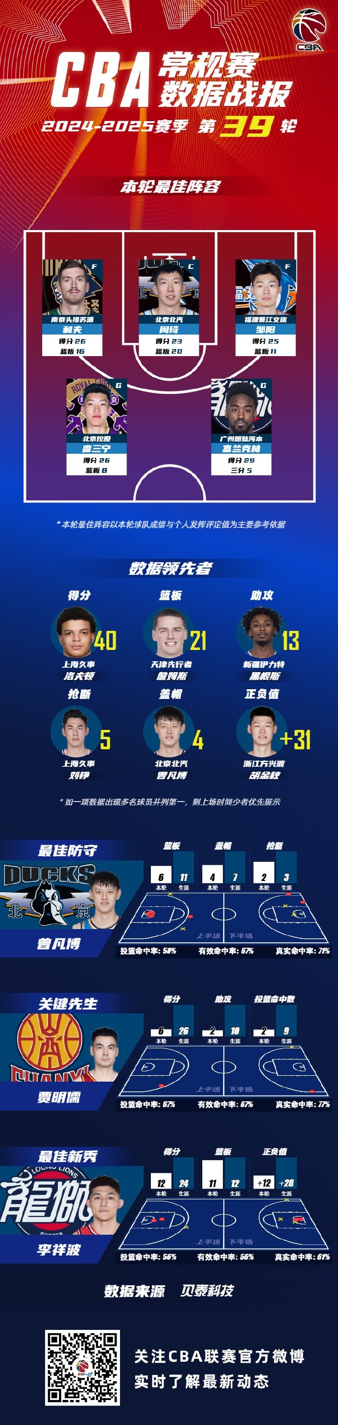 2024-2025賽季CBA聯(lián)賽常規(guī)賽第39輪結(jié)束較量,來(lái)自南京同曦籃球俱樂(lè)部的利夫,北京首鋼籃球俱樂(lè)部的周琦,福建潯興SBS男籃的鄒陽(yáng),北京控股籃球俱樂(lè)部的廖三寧和龍獅籃球俱樂(lè)部的富蘭克林入選CBA聯(lián)賽常規(guī)賽第39輪最佳陣容!