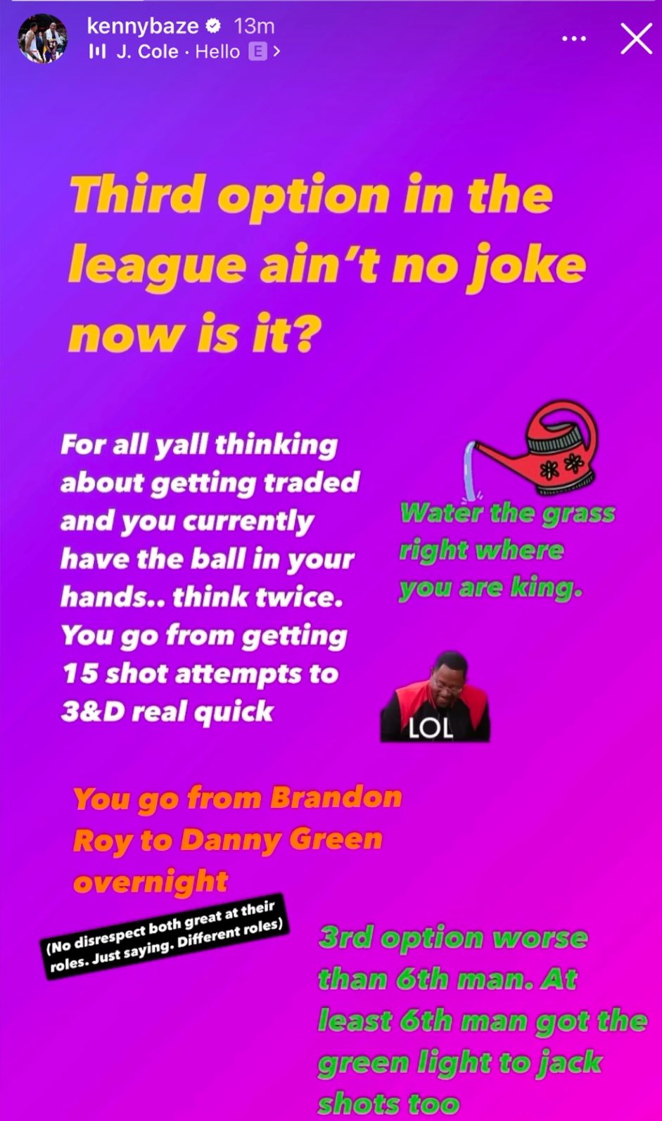 “你一夜之間就會(huì)從布蘭登-羅伊變成丹尼-格林(沒(méi)有不尊重任何人,他們?cè)诟髯越巧锒己馨?,只是角色不同)。在你還是國(guó)王的地方好好享受吧,第三選擇比第六人還差勁,最起碼第六人帶替補(bǔ)的時(shí)候還有無(wú)限開(kāi)火權(quán)!”貝茲莫爾寫(xiě)道。