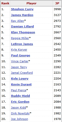 - NBA歷史三分榜:庫(kù)里4000記斷檔第一 哈登3124第二 詹姆斯第七