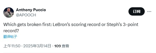 對此,記者Anthony Puccio發(fā)推問道:“詹姆斯的得分紀錄和庫里的三分紀錄,哪個會先被打破?”