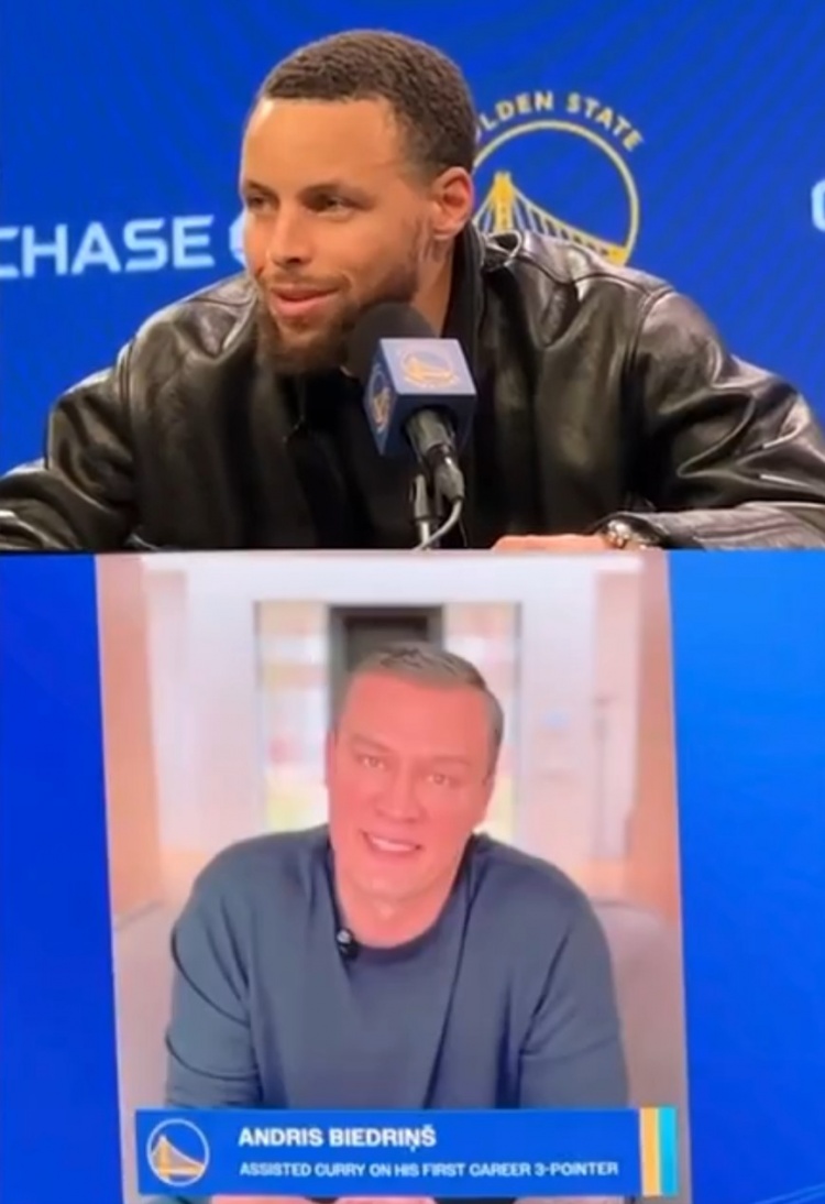 庫里命中4000記三分比賽暫停之后,大屏幕播放視頻紀(jì)念這一時刻,視頻中比德林斯助攻了庫里生涯的第一記三分,這也讓庫里感慨頗深。