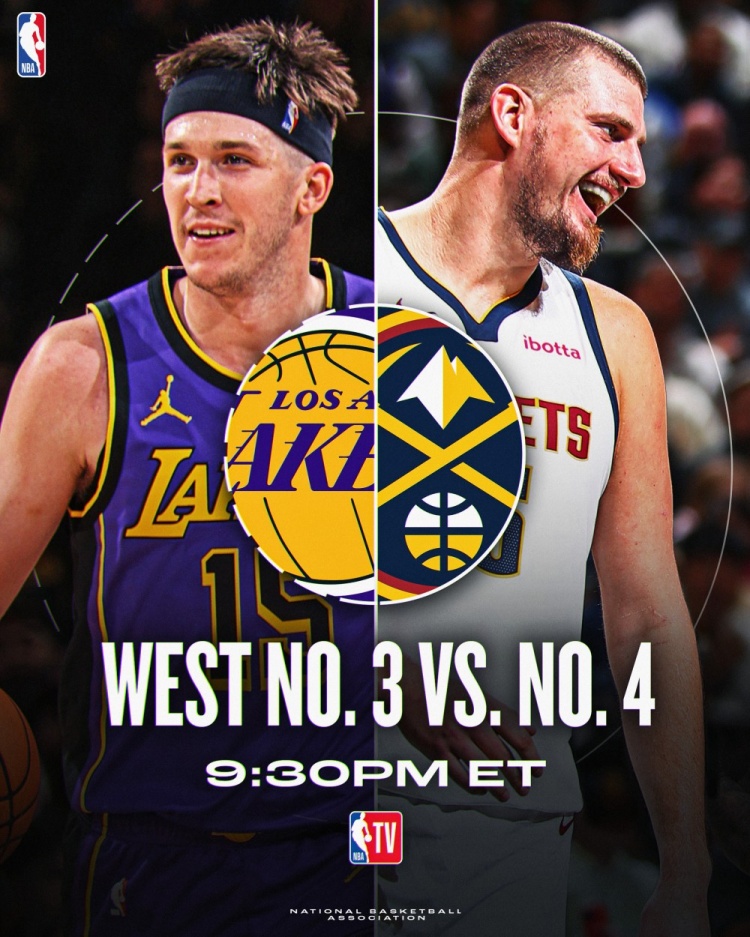 NBA官方曬出海報為本場比賽預熱,封面人物是約基奇和里夫斯,官方配文寫道:“約基奇和(西部)排名第三的掘金將對陣奧斯汀-里夫斯和排名第四的湖人!”