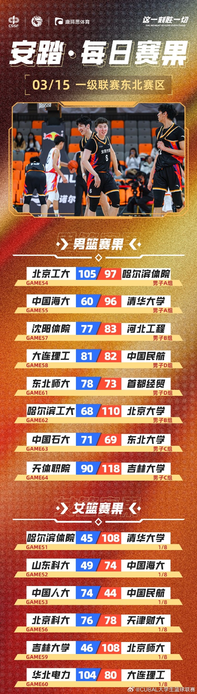 今日的比賽可謂是異常激烈,北京工大加時(shí)戰(zhàn)勝哈爾濱體院,中國民航準(zhǔn)絕殺大連理工,中國石大險(xiǎn)勝東北大學(xué)。值得一提的是,北大6號(hào)昂薩爾出場21分鐘拿下26分,其中真實(shí)命中率達(dá)到恐怖的118%,在此之前汪志鵬也曾打出101%的真實(shí)命中率,不知道今年的北大能否重新奪回東北王的寶座。女籃方面天津財(cái)大加時(shí)戰(zhàn)勝北京科大。