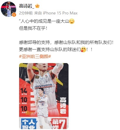 賽后,高詩(shī)巖發(fā)文寫道:“人心中的成見是一座大山,但是我不在乎!感謝邱導(dǎo)的支持,感謝山東隊(duì)和我的所有隊(duì)友們!更感謝一直支持山東隊(duì)的球迷們??!”