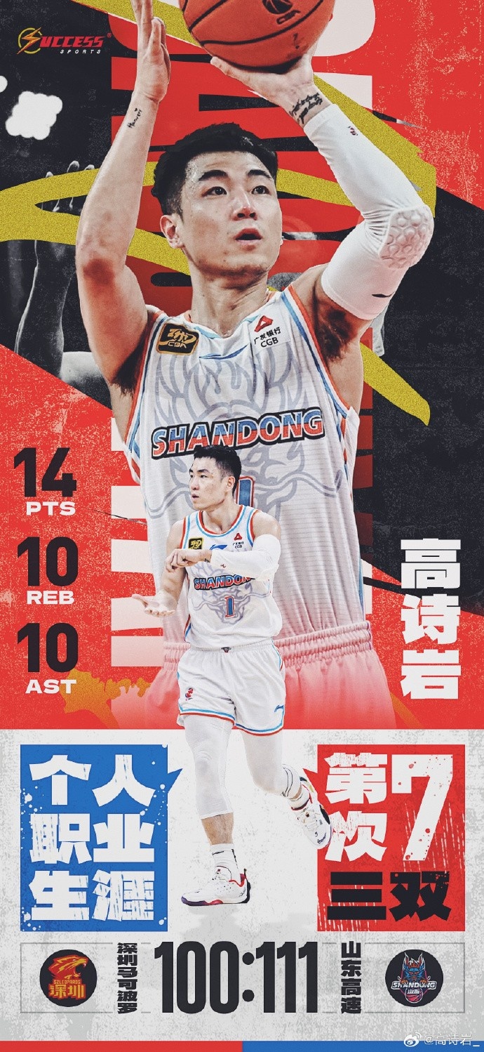 此役山東后衛(wèi)高詩(shī)巖表現(xiàn)非常全面,打了32分鐘6投3中,三分3中2、罰球8中6,砍下14分10籃板10助攻的三雙,還有1搶斷,正負(fù)值+19全場(chǎng)最高。