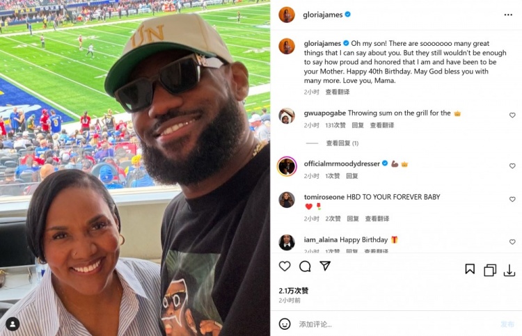 12月31日訊 今天(美國(guó)時(shí)間)是詹姆斯40歲生日,詹姆斯母親格洛麗亞更新INS祝兒子生日快樂。