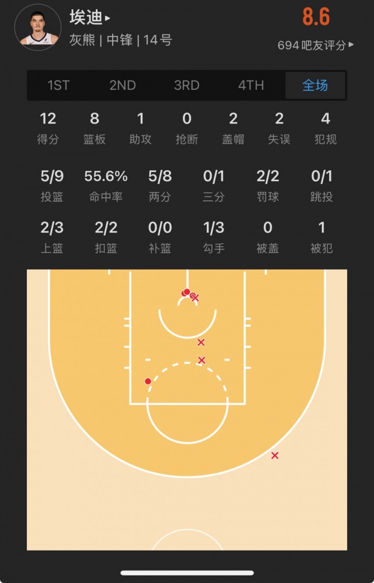 灰熊9號秀 扎克-埃迪 登場27.2分鐘