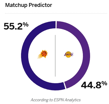 ESPN賽前預(yù)測兩隊本場勝率:太陽55.2%、湖人44.8%。