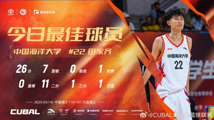 在今日的比賽中,大前鋒田家齊以26分7籃板的狂暴表現(xiàn),率領(lǐng)中國海洋大學(xué)110-107力克大連理工,彌補去年全國賽6分落敗的遺憾。這位身披22號戰(zhàn)袍的內(nèi)線猛獸,用籃下9投7中的高效終結(jié)鑿穿對手禁區(qū)。其5個進攻籃板直接轉(zhuǎn)化為二次進攻得分,恰是去年那場失利留下的成長的痕跡。當技術(shù)統(tǒng)計表上“0失誤”與“57%真實命中率”冰冷陳列,這位大前鋒用最熾熱的方式完成了對過去的回首:去年遺憾落敗的夜晚,他掩面落淚;今夜,他成了親手拆解對手的禁區(qū)判官。