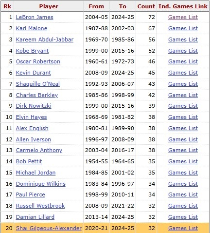 發(fā)布時間:2025年03月17日 12:57點擊:欄目:籃球新聞 3月17日訊 雷霆121-105力克雄鹿。“人類31分精華”亞歷山大再次砍下31分,這是其生涯第33次砍下31分,同期(18-19賽季至今)最多。這段時間內(nèi)排名第二的是字母哥,他24次砍下31分,第三的是詹姆斯的23次。而在NBA歷史上,亞歷山大的33次31分只能排在第18位,排名第一的是詹姆斯的72次,馬龍67次排名第二,賈巴爾56次排第三。賽前的31分場次排名 除特別注明外,本站所有內(nèi)容均為九球直播整理排版,轉(zhuǎn)載請注明出處:人類31分精華亞歷山大33次31分同期最多&歷史第18 第一是老詹 本文標(biāo)簽: 籃球 nba 亞歷山大 詹姆斯 字母哥