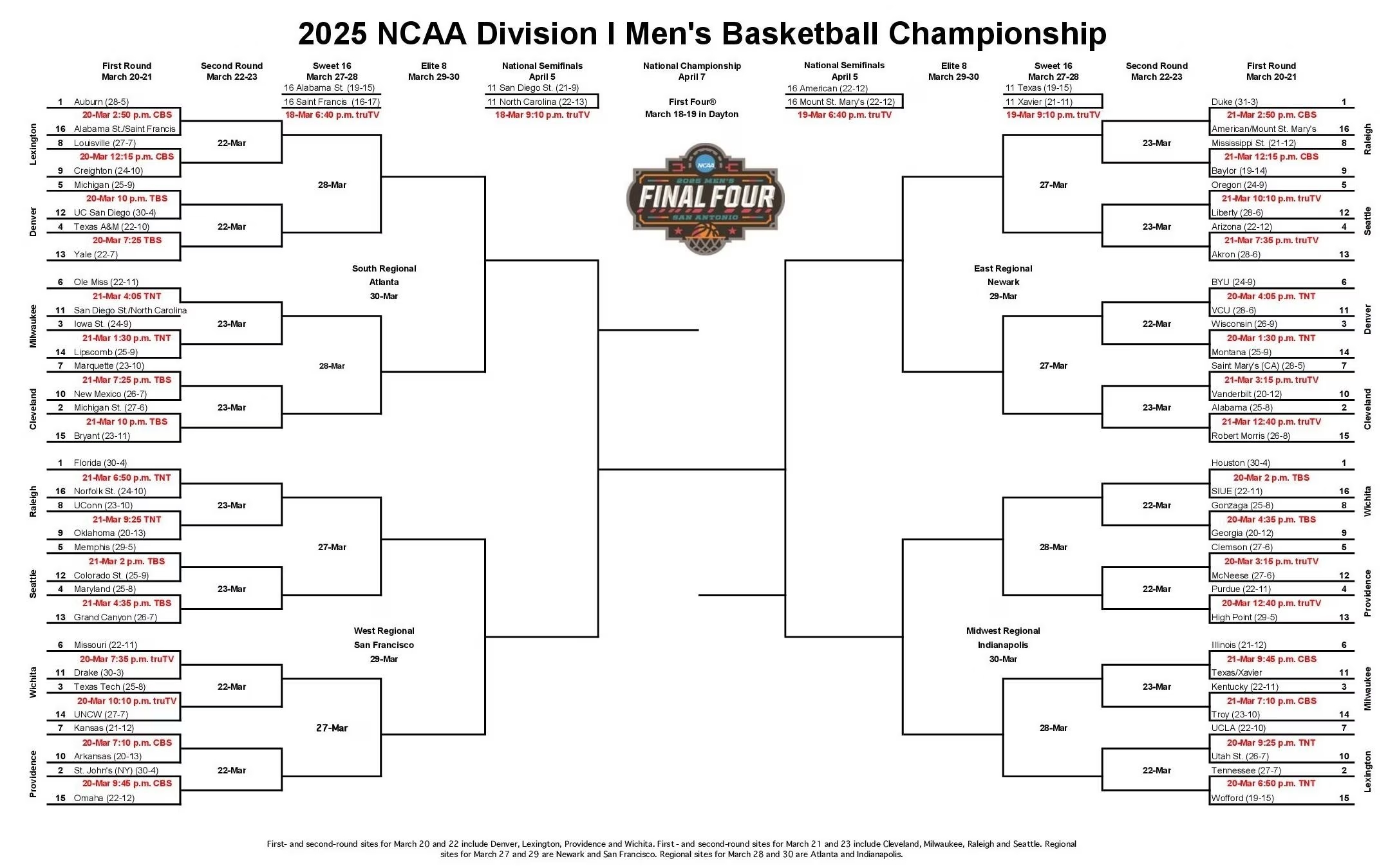 其中四個賽區(qū)的頭號種子分別是:東區(qū)杜克大學、中西區(qū)休斯敦大學、南區(qū)奧本大學、西區(qū)佛羅里達大學。