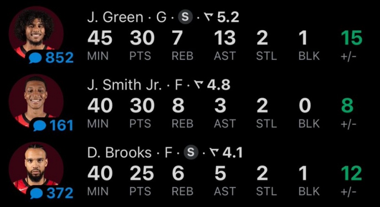 此役,杰倫-格林26投10中,三分17中5,砍下30分7籃板13助攻;小賈巴里-史密斯17中11,三分7中5,砍下30分8板3助攻;狄龍19中8,三分11中5,砍下25分6板5助攻。