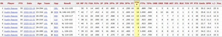 算上今天,里夫斯生涯共九次單場(chǎng)30+,前八次罰球最少得一場(chǎng)是7次,最多的是18次。