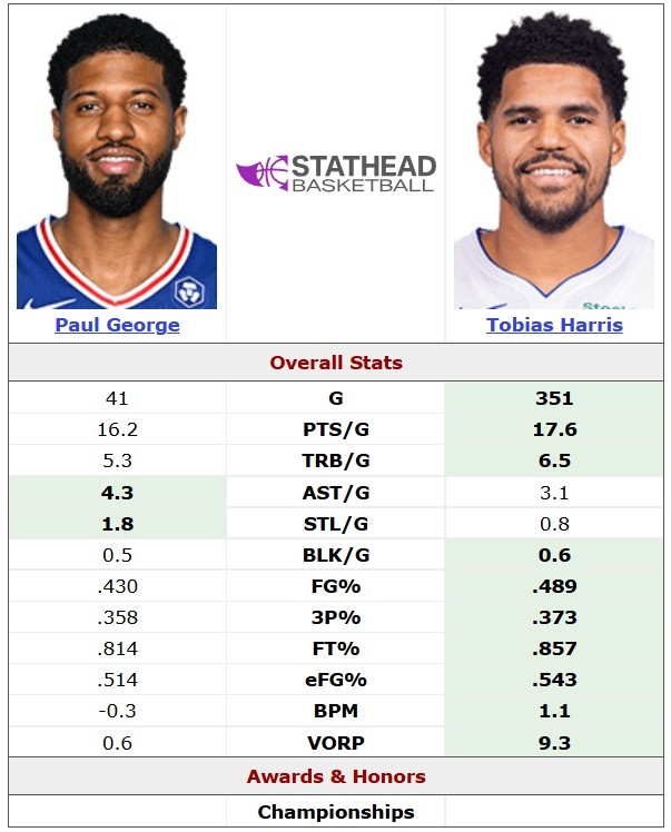 2019年休賽期,76人和托拜亞斯-哈里斯簽下一份5年1.8億美元的合同。在這份合同期間,哈里斯共計(jì)出場(chǎng)351次(出勤率85.6%),場(chǎng)均出場(chǎng)33.7分鐘,得到17.6分6.5籃板3.1助攻0.8搶斷0.6蓋帽,命中率48.9%,三分命中率37.3%,罰球命中率85.7%。