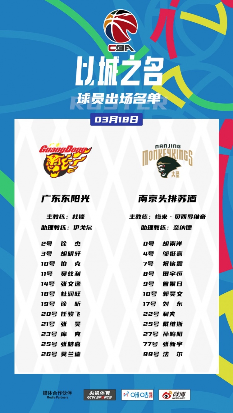 發(fā)布時間:2025年03月18日 20:03點擊:欄目:籃球新聞 3月18日訊 今晚19點35,廣東將在主場迎戰(zhàn)同曦。廣東大名單:徐杰、胡明軒、伯克、貝茲利、張文逸、杜潤旺、徐昕、任駿飛、張昊、庫克、張皓嘉、莫蘭德同曦大名單:胡崇洋、鄔挺嘉、祝銘震、田宇恒、曾繁日、郭昊文、劉東、利夫、戴維斯、孫鳴陽、張新宇、法爾同曦這邊,林葳因腳踝傷病缺陣,趙柏清、哈里斯和法爾則都感染了流感。 除特別注明外,本站所有內(nèi)容均為九球直播整理排版,轉(zhuǎn)載請注明出處:廣東VS同曦大名單:徐杰胡明軒徐昕領(lǐng)銜 郭昊文法爾在列 本文標(biāo)簽: 籃球 CBA 中國籃球 廣東 同曦