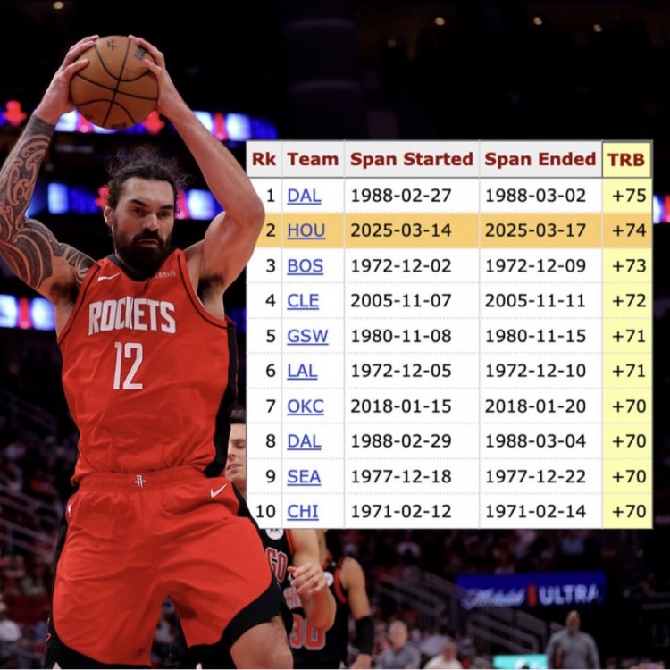 據(jù)統(tǒng)計,火箭能在3場比賽區(qū)間里比對手多搶74個籃板,歷史第2多,僅次于1988年的獨行俠(75個)。