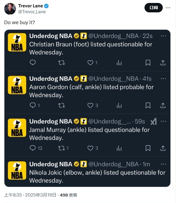 除特別注明外,本站所有內(nèi)容均為九球直播整理排版,轉(zhuǎn)載請注明出處:約基奇穆雷出戰(zhàn)存疑?湖記轉(zhuǎn)發(fā)掘金傷病報(bào)告:我們會(huì)信嗎?