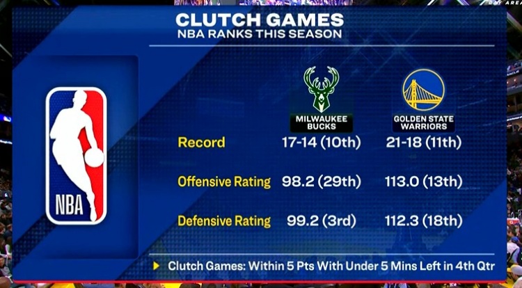 戰(zhàn)績:雄鹿17勝14負(第10),勇士21勝18負(第11)