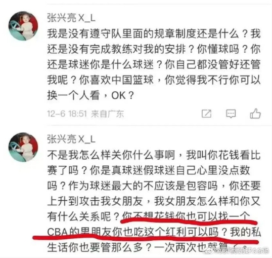 張興亮此前在評(píng)論區(qū)開火:你不想花錢你可以找一個(gè)CBA的男朋友你也吃這個(gè)紅利可以嗎?