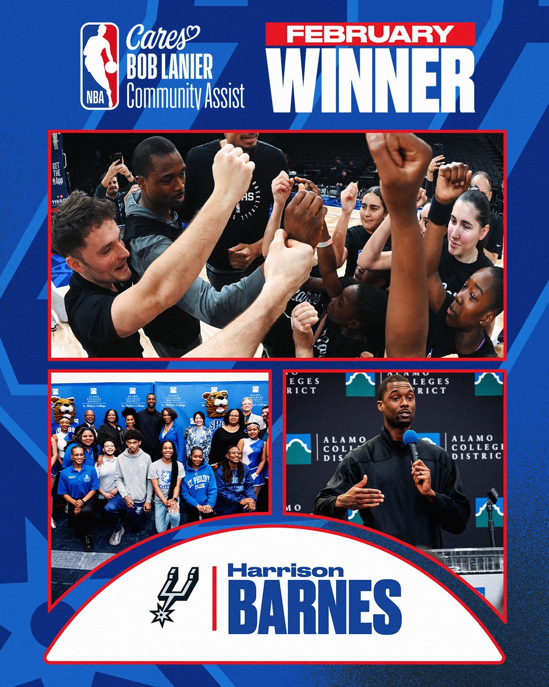 圣安東尼奧馬刺隊前鋒哈里森-巴恩斯被評為2月份的NBA“鮑勃-蘭尼爾”社區(qū)關(guān)懷援助獎(Bob Lanier Community Assist Award)得主。巴恩斯和他的妻子布列塔尼向阿拉莫承諾項目(AlamoPROMISE)捐贈了25萬美元,該項目為符合條件的貝薩縣學(xué)生支付學(xué)費(fèi)和雜費(fèi)。