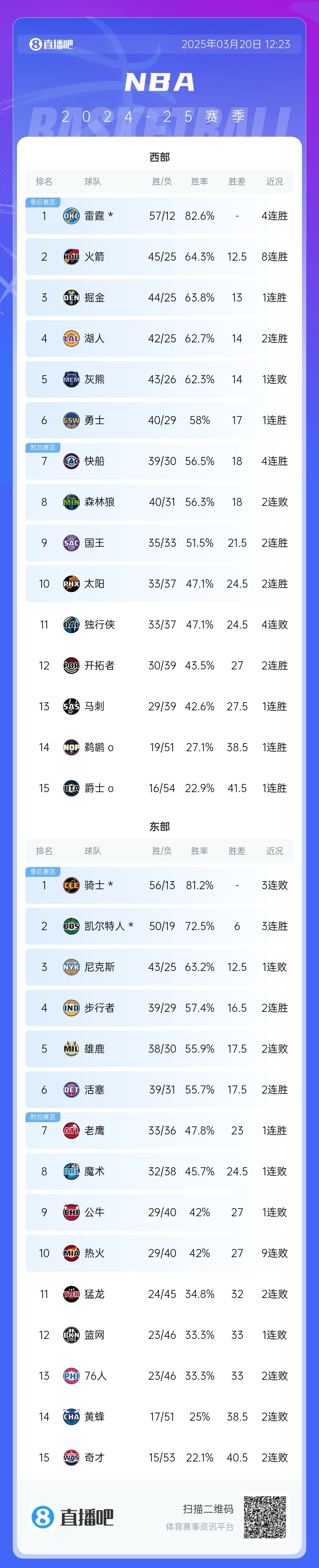發(fā)布時間:2025年03月20日 12:59點擊:欄目:籃球新聞 03月20日訊 NBA常規(guī)賽,太陽127-121擊敗公牛,對其達成11連勝。本場比賽過后,太陽與獨行俠戰(zhàn)績持平,同為33勝37負,太陽憑借交手戰(zhàn)績優(yōu)勢(3勝1負)反超對手,升至西部第十,重回附加賽區(qū)。 除特別注明外,本站所有內(nèi)容均為九球直播整理排版,轉(zhuǎn)載請注明出處:準(zhǔn)備西升??!太陽對公牛11連勝 戰(zhàn)績超越獨行俠殺回附加賽區(qū)! 本文標(biāo)簽: 籃球 nba 太陽 杜蘭特 布克