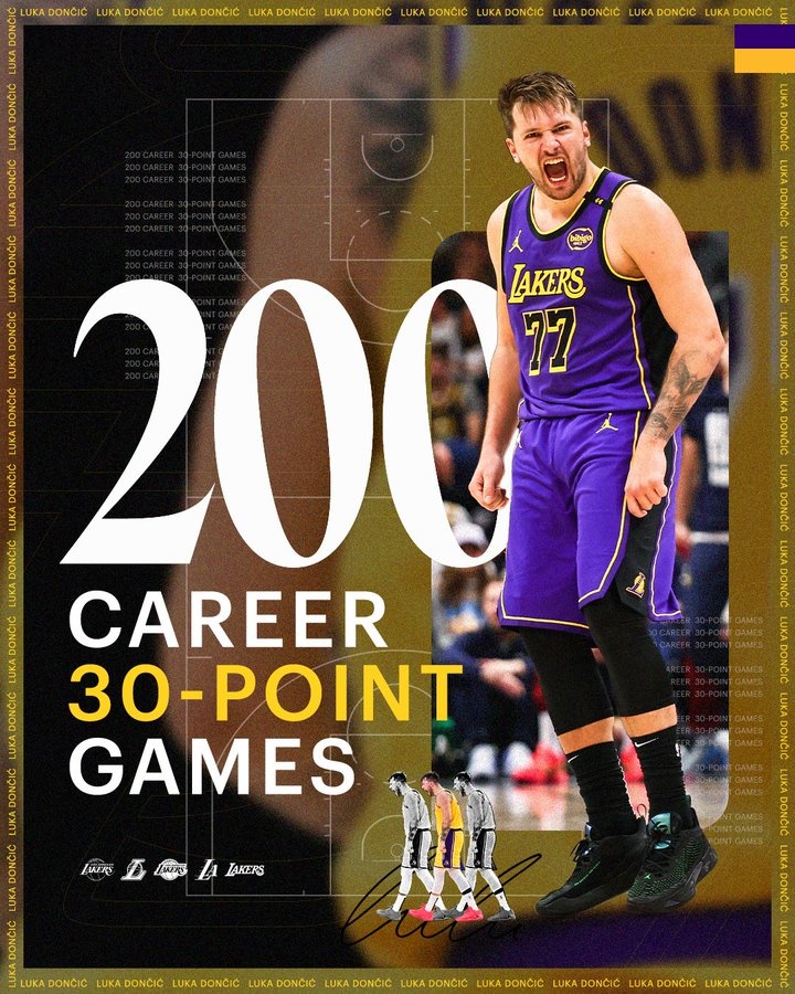比賽第三節(jié)戰(zhàn)罷,東契奇已經(jīng)砍下31分。湖人官推曬照祝賀東契奇,砍下生涯第200個(gè)30+。