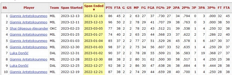 算上上一場(chǎng)的20罰,愛(ài)德華茲在近2場(chǎng)比賽獲得了37次罰球!聯(lián)盟上一個(gè)在2場(chǎng)比賽中罰球37+的球員,是2023年12月的字母哥。榜單按時(shí)間倒序的排名前十如下: