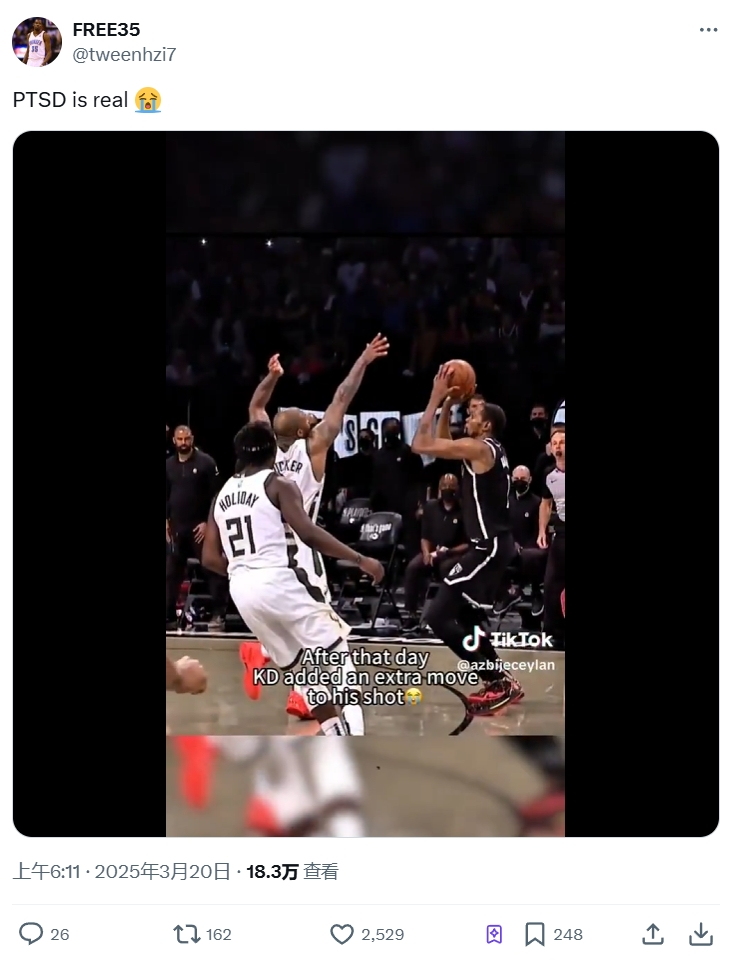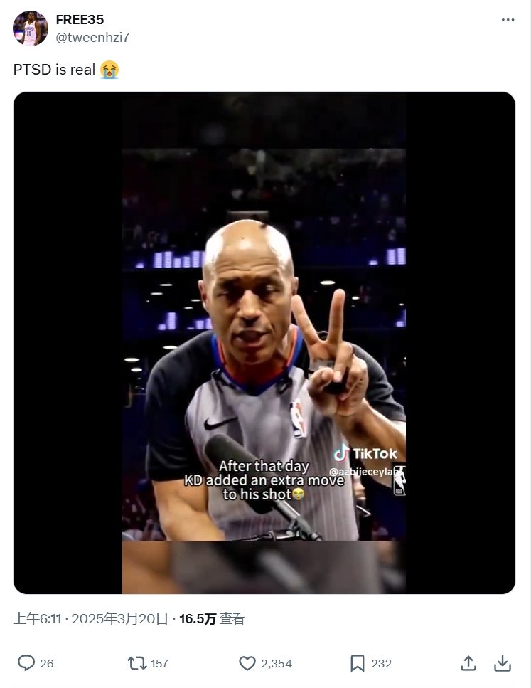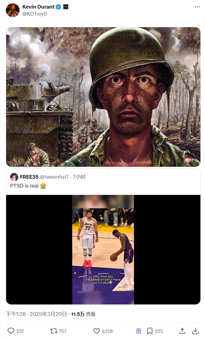 杜蘭特也轉(zhuǎn)發(fā)了這個(gè)視頻,配上了代表PTSD的經(jīng)典表情包,表示認(rèn)可。