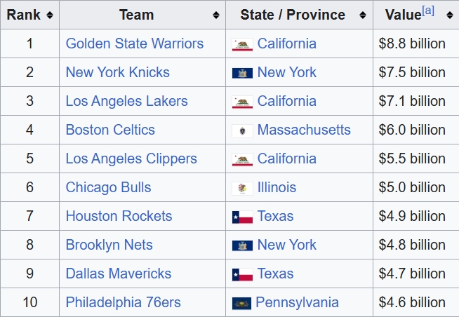 福布斯當(dāng)時(shí)的估值前3分別是勇士88億、尼克斯75億、湖人71億。