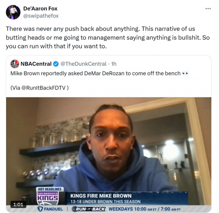 12月31日訊 此前前NBA超六路威表示,他聽說邁克-布朗一直“特別”對待??怂梗€建議德羅贊打替補。
