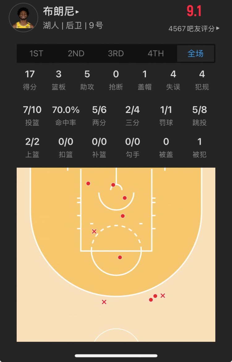 湖人55號(hào)秀 布朗尼-詹姆斯 登場(chǎng)29.9分鐘